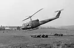 In 1958, the former Luftwaffe airbase at Neuhausen ob Eck was chosen by the Federal Ministry of Defence as one of the airfields for the newly established German Army Aviation Corps and to house an army aviation squadron.[7] It was allocated the ICAO code EDSN.[8] Neuhausen ob Eck Air Base remained under French administration until 1963, when the compound was handed over to the German government. In 1965, the German Army Aviation Corps became the new occupant of the airbase.[9] With the arrival of Army Aviation Squadron 10, relocating from Friedrichshafen Air Base, Neuhausen ob Eck Air Base became operational in 1966.[10] Army Aviation Squadron 10 flew Alouette II and Sikorsky H-34 helicopters as well as Dornier Do 27 fixed-wing aircraft.[11] However, the German Army had realised that helicopters would fulfill the Army Aviation Corps' designated tasks better than fixed-wing aircraft, and the Dornier 27 were phased out.[12] From 1964 on, these aircraft were handed over to other users so that Army Aviation Squadron 10 only had a few Do 27 at their disposal when they arrived at Neuhausen ob Eck Air Base. The majority of aircraft used were helicopters.[13] Transport helicopter H-34 was also gradually transferred to other units around the same time. In 1967, the squadron was renamed Army Aviation Battalion 10. Four years later, in 1971, the unit was returned its original designation, Army Aviation Squadron 10, when No 2 Squadron of Army Aviation Battalion 10 moved to Roth Air Base to form, together with other elements of the German Army Aviation Corps, Army Aviation Regiment 20. In 1979, this regiment, flying Bell UH-1D,[14] relocated to Neuhausen ob Eck Air Base. In 1983, the helicopters flown by Army Aviation Squadron 10, Alouette II, were replaced with the Bo 105M.[15]