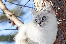 The Neva Masquerade is a breed or sub-breed of long-haired domestic cat, which originates in Russia.[1][2] It is the sister breed[3] or colourpoint variant of the Siberian cat, a centuries-old Russian landrace. The colourpoint markings are the result of a colourpoint gene originally found in Siamese cats.[4] The Neva Masquerade is believed to be derived from crossing the Siberian cat with Asian colourpoint cats, such as the Siamese or Thai, or possibly cats related to those, such as the colourpointed Persian cats.[3][5][6] Some cat registries may classify the Neva Masquerade as a colourpoint variety or sub-breed of the Siberian cat, while others consider it to be a separate sister breed. Regardless of its classification, all Neva Masquerade cats are selectively bred and pedigreed today in all major cat fancier and breeder organisations under the Siberian (Forest) cat or Neva Masquerade. This means that all Neva Masquerade cats are purebred cats with a formally registered ancestry.