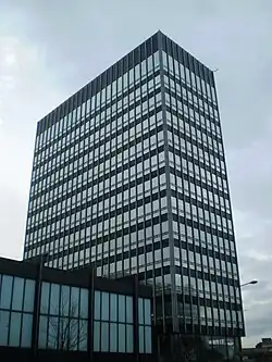 New Century House was designed by G. S. Hay and Gordon Tait and constructed by John Laing & Son for the Co-operative Insurance Society in 1962.[2] The attached New Century Hall has a capacity of 1,000 people. New Century House and Hall were listed in 1995 as Grade II as a good example of a high-quality post-war office building. It is considered one of the finest modernist towers in the United Kingdom alongside its sister building the CIS Tower (1962, Grade II), the Arts Tower in Sheffield (Grade II*) and Euston Tower (1970) in London. It is described in its listing as, "A design of discipline and consistency which forms part of a group with the Co-operative Insurance Society".[1]