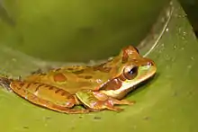 The New Granada cross-banded tree frog (Smilisca phaeota), also known as the masked tree frog, is a species of frog in the family Hylidae found in Colombia, Costa Rica, Ecuador, Honduras, Nicaragua, and Panama. Its natural habitats are subtropical or tropical dry forest, subtropical or tropical moist lowland forest, rivers, freshwater marshes, intermittent freshwater marshes, plantations, rural gardens, urban areas, heavily degraded former forests, ponds, and canals and ditches.