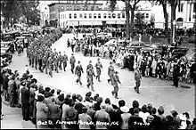 During World War II, the New Hampshire National Guard was mobilized into federal service on 16 September 1940. The 197th Coast Artillery was sent to Australia in 1942. When antiaircraft units were split from coast artillery in May 1943, the regiment was reorganized and became the 197th Antiaircraft Artillery Group, including the 744th (Gun) and 210th (Automatic Weapons) Antiaircraft Artillery Battalions and the 237th Antiaircraft Artillery (Searchlight) Battalion. These units provided air defense during the island-hopping campaigns in the South West Pacific theatre from 1942 to 1944 and the Philippines campaign in 1944 and 1945.[3][1] The 172nd Field Artillery Regiment remained stateside until it was broken up in 1943 and eventually formed the XVI Corps Artillery headquarters, 172nd Field Artillery Battalion and 941st Field Artillery Battalion. The latter two battalions served with V Corps artillery with in France and Germany.[1][4] Back in New Hampshire, the New Hampshire State Guard was reactivated in 1941 to fill the state responsibilities of the National Guard in 1941.[5]