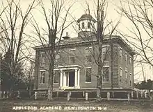 New Ipswich was granted in 1735 to 60 inhabitants of Ipswich, Massachusetts, whence the name is derived, by colonial Governor Jonathan Belcher and the General Court (Assembly) of Massachusetts. Settlement began in 1738, when Abijah Foster arrived with his wife and infant daughter. In 1762, Governor Benning Wentworth incorporated the town as "Ipswich", and then in 1766 as "New Ipswich". New Ipswich Academy, later renamed Appleton Academy after benefactor Samuel Appleton, was chartered in 1789,[3] the second oldest in New Hampshire after Phillips Exeter Academy in Exeter. It would also serve as high school for the nearby communities of Mason and Greenville. In 1969, construction of Mascenic Regional High School was completed, rendering high school teaching in Appleton no more, although the building was still used to teach elementary schoolers and middle schoolers. In 1989 Boynton Middle School completed construction, so Appleton was from then to 2012 an elementary school. Appleton Academy closed in 2012, due to the dangerous conditions of occupying it.