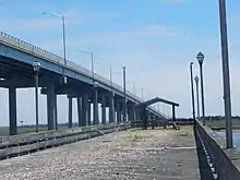 Route 152 originally went along a lower wooden bridge across the Broad Thoroughfare. At least six people drowned from traffic accidents along the bridge from 1976 to 1986. Atlantic County Assemblywoman Dolores G. Cooper helped secure state funding for a new bridge, which opened September 1988 at a cost of $21 million.[5] The new 2,860-foot-long (870 m) bridge was completed to the north of the former route.[6] The former alignment to the south, designated as Old Road,[1] is currently being demolished with the former fishing pier as of 2017. The route has remained intact virtually since 1988.[7] In 1994, the new bridge was named the Dolores G. Cooper Bridge.[5]