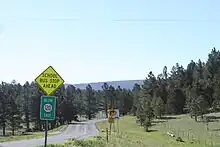 Crossing the Canadian River bridge the road enters Harding County and then heads north-northeast about 8 miles (13 km) into the town of Roy.[4] The road comes into Roy as the Wagon Mound Highway, then zags up to Second Street and then up to Third Street where it intersects with Route 39. Then heading three blocks east as Third Street, the road turns due north as Floersheim Street and leaves Roy as the Yates Highway. Running along section lines the road heads north and east intermittently, passing numerous ranch roads and going through part of the Kiowa National Grassland which is predominately north of the road,[6] for 27 miles (43 km) to the community of Yates. Four miles (6.4 km) later heading due north the road passes into Union County.[4] After 12 miles (19 km) in Union County headed mostly north, but still on section lines, the road terminates at its intersection with U.S. Route 56 and U.S. Route 412 8 miles (13 km) east of Gladstone.[4] A dirt road continues north at that point for a couple of miles into the Don Carlos Hills.[4]