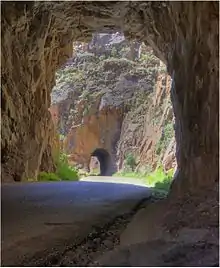 The road through the Rio Guadalupe box canyon bears the designation Forest Road 376 in Santa Fe National Forest near the unincorporated town of Cañones (or Gilman). The continuation as Forest Road 376 eventually terminates at New Mexico State Road 126 east of San Pedro Parks Wilderness. The route incorporates the Gilman Tunnels (1 mi (1.6 km) beyond the transition to Forest Road 376) which was part of the former Santa Fe Northwestern Railway (SFNW) through the canyon which was used to haul lumber from the Jemez Mountains. The railway opened in 1924 but never recovered financially from the Wall Street Crash of 1929,[3] and ceased operations in May 1941 following flood damage from the Rio Guadalupe.[4]