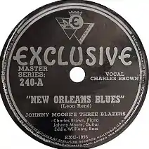 "New Orleans Blues" is a song written by Leon René and performed by Johnny Moore's Three Blazers,[1][2] consisting of Charles Brown on vocals and piano, Johnny Moore on guitar, and Eddie Williams on bass.[3][4][5] The record which was released in 1947 on the Exclusive label (catalog no. 240).[2] It debuted on Billboard magazine's race records chart on June 28, 1947, peaked at No. 2, and remained on the chart for 13 weeks.[6] It was ranked No. 11 on the Billboard's year-end list of the most played race records of 1947.[7]