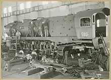 In 1943, approval was given for the New South Wales Government Railways Workshops to build 25 freight locomotives. The design was a modified version of the 57 class. The main alterations were the use of a rack and pinion valve gear[1] in lieu of the Gresley 2:1 conjugated valve gear for the middle cylinder and the use of smaller cylinders to enable the locomotives to run to on the Main North line to Broadmeadow, a route which had a tighter loading gauge. They also used a Woodard divided drive of twin coupling rods between the second and third driving wheels. A valance was fitted over the valve gear on the front platform.[2] Similarly to the earlier D57 class and the later AD60 class, the 58 class were fitted with a mechanical stoker to feed the large firebox