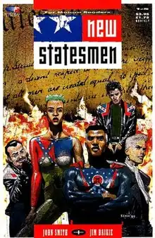 "New Statesmen" is a British revisionist superhero comic story. It was originally published in the adult-orientated anthology comic Crisis between 17 September 1988 to 18 March 1989, with a brief return on 30 September 1989. Written by John Smith and initially with art from Jim Baikie, the story took place in America, 2047 and revolved around the Optimen, a group of genetically engineered superheroes assigned to each U.S. state - one of whom is running for President.