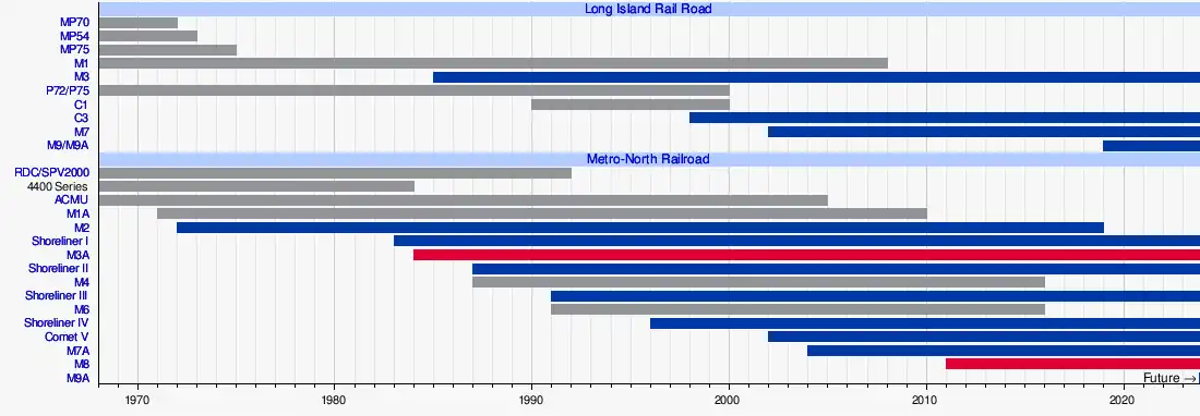 The first cars were built in 1906–1907 by American Car and Foundry Company and St. Louis Car Company, which together delivered 182 all steel MUs to the New York Central Railroad. They were built for the electrification of the Hudson Division north of High Bridge and the electrification of the Harlem Division north of Wakefield.[1] The cars were numbered 4000–4173 featured arched stained glass windows located above each set of windows.[2] The glass would be covered later on making it appear that the cars had small and low windows.[1]
