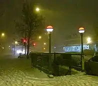 Of the 472 stations in the system, 470 are served 24 hours a day.[lower-alpha 3] Underground stations in the New York City Subway are typically accessed by staircases going down from street level. Many of these staircases are painted in a common shade of green, with slight or significant variations in design.[5] Other stations have unique entrances reflective of their location or date of construction. Several station entrance stairs, for example, are integrated into adjacent buildings.[5] Nearly all station entrances feature color-coded globe or square lamps signifying their status as an entrance (see below).[6]