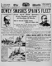 ![]() New York World cover announcing conquest of Dewey of the Spanish Navy in the Battle of Manila Bay in May 1898 | |