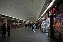 After the September 11 attacks, security was increased and passenger flow curtailed. In 2002, $100 million of work added security features such as lighting, cameras, and barricades.[51] The taxiway under Madison Square Garden, which ran from 31st Street to 33rd Street at mid-block, was permanently closed off with concrete Jersey barriers. Escalators providing direct access to the lobby of Madison Square Garden were closed and later removed. The underground Gimbels Passageway connecting pedestrians to 34th Street–Herald Square has been sealed off since 1986,[52] after decades of safety concerns and sexual assaults.[53]