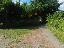 Just outside Athol Springs, NY 75 passes under two railroad bridges, carrying the Norfolk Southern Railway-owned Lake Erie District line and the CSX Transportation-owned Lake Shore Subdivision line over the highway. On the other side of the overpasses, NY 75 curves northeastward as it becomes Saint Francis Drive, leaving Camp Road to continue northwestward to the lake as a two-lane street. The route continues on, passing south of Saint Francis High School before ending shortly afterward at a partial interchange with NY 5. NY 75 northbound merges directly into NY 5 eastbound, a limited-access highway, while NY 75 southbound begins as an offshoot of NY 5 westbound. The remaining connections are made by way of a loop road leading from Big Tree Road, which NY 5 and NY 75 both intersect just south of the interchange.[6]
