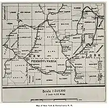 The New York & Pennsylvania Railroad (NYP) was a single track, shortline railroad running on a route described as east—west in the company's timetables,[1]: between 6 and 7 but closer to an arc: almost due south along Bennett's Creek from Canisteo through the hamlets of Greenwood, Rexville, and Whitesville, New York, southwest through Genesee, Pennsylvania to Oswayo, Pennsylvania, then northwest through Shinglehouse, Pennsylvania to Ceres, New York.[1]: between 6 and 7 In Canisteo trains made "a close connection" with "electric cars for Hornellsville". Trains connected in Canisteo with the Erie Railroad, with service to Buffalo and New York City; in Genesee with the Buffalo and Susquehanna Railroad, with service to Wellsville, New York, and in Ceres with the Pittsburg [sic], Shawmutt, and Northern Railroad, with service to Olean, New York, and points west.[1] While the railroad did not serve Hornell, occasionally it did run special trains, using the Erie tracks. Its route was primarily in southwestern Steuben County, New York, and northern Potter County, Pennsylvania, with small portions in Allegany County, New York, and McKean County, Pennsylvania. Total track was 56.13 miles (90.33 km) main line and 7.69 miles (12.38 km) of sidings.[1]: 9