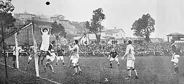 New Zealand's first international football match was played in Dunedin at the old Caledonian Ground on 23 July 1904 against a team representing New South Wales. New Zealand lost by the game's only goal, but drew with the same team 3–3 in a game at Athletic Park, Wellington seven days later.[5] The following year the team played a Wellington representative side on 10 June before embarking on a tour of Australia, during which they played eleven representative sides, including three "test matches" against New South Wales. Of these three matches they won one, lost one, and drew one.