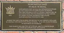In 1859, an additional school was opened to satisfy the needs of parents who wanted a government controlled school. Newcastle Public School was opened in Brown Street in the basement of the Congregational Church, after which it moved to a classroom opposite the current site.[1] In 1878, the school moved to the current site in Tyrrell Street. The success of this new public school led the state government to take control of the church school in 1883 and name it Newcastle East Public School.