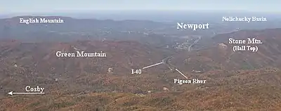 Newport is located in western Cocke County and is situated along the Pigeon River in an area where the foothills of the Great Smoky Mountains descend into the French Broad drainage basins. English Mountain rises prominently to the southwest and Hall Top Mountain rises to the southeast, with the Pigeon River cutting a valley between the two. The Great Smoky Mountains National Park boundary passes some 15 miles (24 km) to the south.