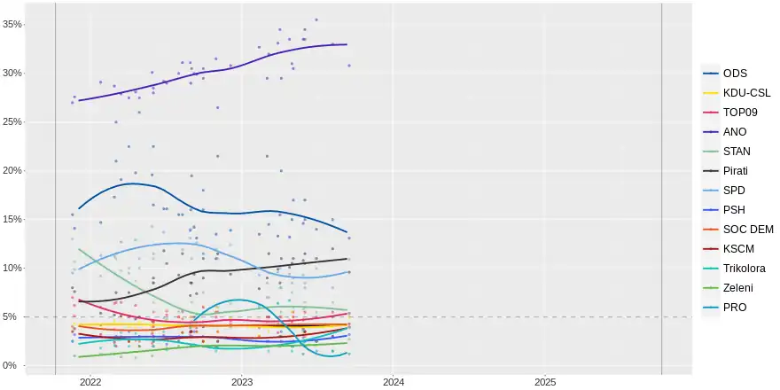 The 2021 parliamentary elections saw the conservative alliance Spolu (consisting of the Civic Democratic Party (ODS), KDU-ČSL and TOP 09) finish first with 27.8% of the vote. ANO 2011 finished second and liberal alliance Pirates and Mayors third. Freedom and Direct Democracy was the only other party to win seats. Spolu formed a government with Pirates and Mayors with ODS leader Petr Fiala as Prime Minister.