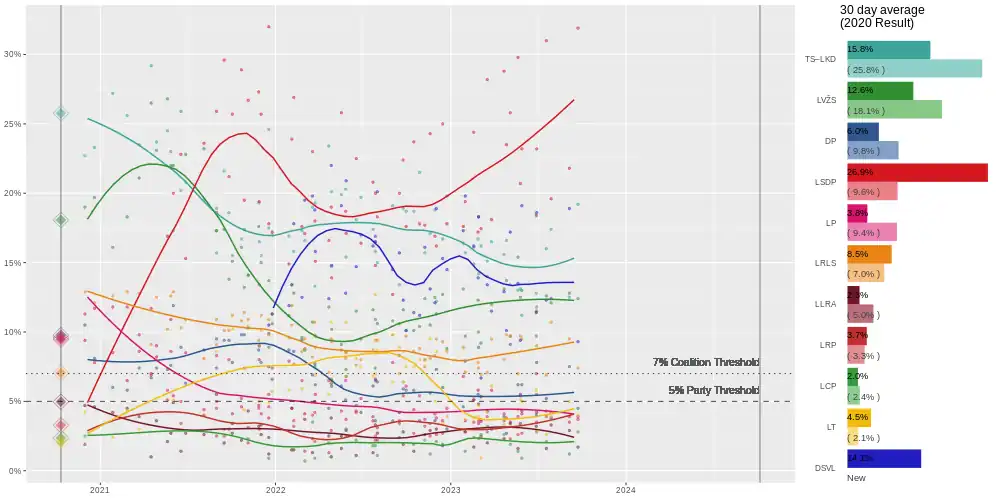 | Baltijos tyrimai | 14–29 June 2023 | 1,020 | 11.8 | 11.5 | 7.8 | 23.2 | 3.5 | 9.0 | 4.2 | 5.5 | 2.8 | 2.9 | 18.6 | 4.6 |
