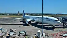 There have been several plans made seeking a solution to the expansion problems at Ngurah Rai International airport. There have been proposals to develop a north–south runway, but existing land use in the areas adjacent to the airport makes this idea unfeasible due to the considerable land purchase costs. A completely new airport was proposed to ease the airport' congestion due to the area surrounding the existing airport not supporting significant long-term expansion. A masterplan was announced for works at this airport for 2009–2011, which includes a new international terminal with 120,000 square metres (1,300,000 sq ft) in area to be built and the existing international terminal with area of 56,000 square metres (600,000 sq ft) will be renovated for use as a new domestic terminal. The new international terminal opened in November 2013, while the domestic terminal opened on 17 September 2014 with an area of 65,800 square metres (708,000 sq ft), eight departure and seven arrival gates, five passenger boarding bridges, five conveyor belts, as well as more counters — 62 for check-in, 4 for transit and 19 for ticketing.[11] And can accommodate 25 million passengers a year until 2025.[12][13] This provided land for building a new horseshoe shaped building for 17 passenger aircraft parking at the east area on the former domestic terminal. The plan also incorporated a runway extension to 3,600 m. Currently airplanes up to the size of Boeing 747-400, Boeing 747-8, Boeing 777-300ER, Boeing 787-10, and Airbus A350-1000 can use the airport. Although Ngurah Rai International Airport already has a parking slot for the Airbus A380, some taxiway turns are still being widened to accommodate the superjumbo jet.[14]