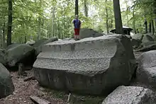 The first section of the Nibelungensteig is divided into three legs that are between 12 and 15 kilometers long. The first leads from Zwingenberg (Bergstraße) over the Melibokus hill and the Felsberg hill. At the base of the Felsberg lies the Felsenmeer (“rock chaos” or “sea of rocks”)[6] to Reichenbach.[7] The second leg passes by the Hohenstein, a quartzite rock popular with rock climbers, and Lindenfels. From there the third leg leads to one of the so-called Siegfried's spring (Siegfriedbrunnen), near Grasellenbach. Out of all the Siegfried's springs in the Odenwald, at which Siegfried was supposedly assassinated by Hagen, the one near Grasellenbach is the best known. Another of the springs is the Zittenfeldener Quelle (spring of Zittenfeld).[8]