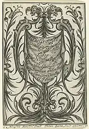 In 1623 a book was published in London under the title De Grotesco. Per utilis atq omnibus quibus pertinebit valde necessari Liber per Nicasius Rousseel ornatissimo, generosissimo atq variarum artium peritissimo viro Domino G Heriot. It contained prints engraved by Johan Barra (or Bara, or Jan Barra) after designs by Roussel and was dedicated to the Scottish goldsmith to the court and philanthropist George Heriot.[9] Each page consists of a frame filled with grotesques composed of human masks and animal and bird monsters attached to plant forms.[10] In 1644 a Dutch language version of 12 of the plates was published in Amsterdam by Claes Jansz. Visscher under the title Seer aerdige / GROTISSEN / dienstich / alle die de Teyckenkonst hanteren / getekent door / Nicasius Rouseel / gedruckt bÿ / CJVisscher. A.o / 1644. This set was subsequently re-issued probably by Nicolaes Visscher II around 1680 and by Joannes de Ram in 1684.[11]