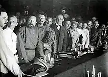 To complicate matters further, the Bolsheviks themselves were divided into a right wing and a left wing. The right-wing of the Bolsheviks, including Aleksei Rykov and Viktor Nogin, controlled the Moscow Committee, while the younger left-wing Bolsheviks, including Vladimir Smirnov, Valerian Osinsky, Georgii Lomov, Nikolay Yakovlev, Ivan Kizelshtein and Ivan Stukov, were members of the Moscow Regional Bureau.[8] On 10 October 1917, Bukharin was elected to the Central Committee, along with two other Moscow Bolsheviks: Andrei Bubnov and Grigori Sokolnikov.[9] This strong representation on the Central Committee was a direct recognition of the Moscow Bureau's increased importance. Whereas the Bolsheviks had previously been a minority in Moscow behind the Mensheviks and the Socialist Revolutionaries, by September 1917 the Bolsheviks were in the majority in Moscow. Furthermore, the Moscow Regional Bureau was formally responsible for the party organizations in each of the thirteen central provinces around Moscow – which accounted for 37% of the whole population of Russia and 20% of the Bolshevik membership.[8]