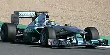 In mid-to-late 2009, Mercedes-Benz vice-president of motorsport Norbert Haug discussed with Rosberg the possibility of driving for the manufacturer in 2010 pending its acquisition of Brawn GP.[76] Rosberg also talked to McLaren and Williams about potential employment; he was skeptical because Williams was mulling over whether Renault or Cosworth should be the team's engine supplier.[77] On 29 October, he confirmed his departure from Williams at the conclusion of the season[78] and was officially released from his contract with the team on 1 January 2010.[79] One week later Mercedes purchased 75 percent of Brawn GP and entered Formula One under its own name, employing Rosberg to drive for the team.[30] He was partnered with the seven-time world champion Michael Schumacher[80] and was assigned car No. 4 after Schumacher requested No. 3 for superstitious reasons.[81]