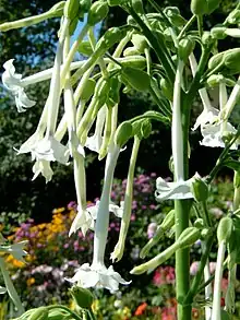 This plant is thought to be one of the parents of Nicotiana tabacum, the plant used in modern tobacco production.[2] However, all parts of N. sylvestris can cause discomfort or irritation if consumed.