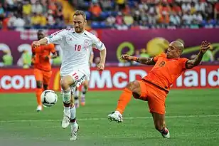 De Jong was part of the Dutch team for the 2010 FIFA World Cup managed by Bert van Marwijk.[50] The player was in the starting line-up for their first match in the competition, a 2–0 victory over Denmark.[51] He was suspended in the semi-final against Uruguay after receiving his second yellow card of the tournament in the Netherlands' quarter-final win over Brazil.[52] He played in the Final of the competition, which the Netherlands lost 1–0 to Spain after extra time. In the early stages of the match, De Jong made a chest high challenge on Xabi Alonso, with his studs making contact with the Spaniard's ribs. Referee Howard Webb later stated that he would have sent off De Jong if he'd had a better view of the incident.[53]