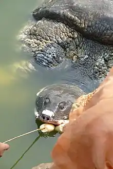 With the species existing in very limited areas with high human traffic, these turtles have become dependent upon visitors for feeding. Visitors tend to feed a mixture of grains, fruits, and various meat products.[15] These interactions with direct feeding have created a dependence for these turtles on the people, since this species no longer has a need for hunting. This had made it hard to determine the natural diet of the species. However, with the ability to consume the foods provided by the people, their diet is commonly compared to that of other species within the same genus. These organisms are on the omnivore scale of the food consumption, consisting of plants and small animals like fish and worms.[12]