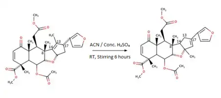 To obtain this product, Nimbin was taken in a 100mL single-necked round bottom flask fitted with a guard tube, followed by 10mL acetonitrile. The solution is cooled to 0 °C, and 0.5ml of concentrated sulfuric acid is slowly added while stirring. The reaction is left until the room temperature is reached and mixed once again for 6 hours.