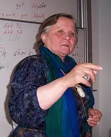 Afanasyeva is fluent not only in Kildin Sami and Russian, but also in Northern Sami and German. She has been working publishing a dictionary for her native dialect, which has hardly been documented by linguists so far. For this purpose, she has been working for several years on the systematization of the familiar vocabulary and collects, with the help of the few surviving speakers, new words, phrases, and place names from the area of their forcibly-displaced birthplace.[1]