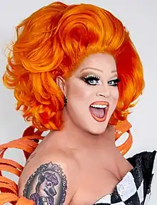Levitt competed in the eleventh season of RuPaul's Drag Race.[15] He had previously auditioned for the show nine times, but failed to make the final cast selection. He won the third episode for his performance in the 'Diva Worship' challenge, and impersonated Sarah Sanders on the fourth episode, "Trump: The Rusical".[16] In the "Snatch Game" challenge, he became the first queen in the show's history to impersonate someone from the actual original Match Game, with his impersonation of Jo Anne Worley.[17] He then won the "Dragracadabra" challenge in episode ten.[18][19] He was eliminated in the following episode, losing a lip sync to Silky Nutmeg Ganache.[20][21] He was subsequently crowned Miss Congeniality in the series finale.