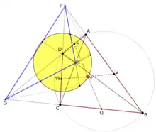 The nine-point circle is also known as Feuerbach's circle (after Karl Wilhelm Feuerbach), Euler's circle (after Leonhard Euler), Terquem's circle (after Olry Terquem), the six-points circle, the twelve-points circle, the n-point circle, the medioscribed circle, the mid circle or the circum-midcircle. Its center is the nine-point center of the triangle.[3][4]