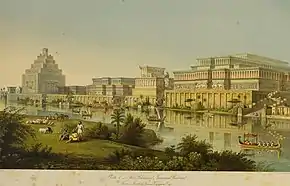 It has been suggested that Ninurta was the inspiration for the figure of Nimrod, a "mighty hunter" who is mentioned in association with Kalhu in the Book of Genesis, although the view has been disputed.[3] He may also be mentioned in the Second Book of Kings under the name Nisroch.[lower-alpha 1] In the nineteenth century, Assyrian stone reliefs of winged, eagle-headed figures from the temple of Ninurta at Kalhu were commonly, but erroneously, identified as "Nisrochs" and they appear in works of fantasy literature from the time period.