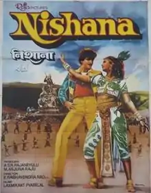Nishana (transl. Target) is a 1980 Indian Hindi-language action film,[3] produced by M. Arjuna Raju, A. S. R. Anjineelu under Roja Movies banner and directed by K. Raghavendra Rao. Starring Jeetendra, Poonam Dhillon and music composed by Laxmikant–Pyarelal. The film is remake of the Telugu film Vetagadu (1979). Both the movies are made by same banner & director. The film partly inspired the 2010 comedy Housefull.[4]