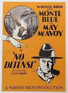 No Defense is a 1929 American romantic drama film directed by Lloyd Bacon and starring Monte Blue. It was a part-talkie sound film with talking sequences and a music track (synchronized score and sound-effects) using the Vitaphone system. It was distributed by Warner Brothers.[1][2]