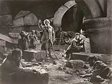 7,500 extras worked on the film.[4] During the filming of the climactic flood scene, the 600,000 US gallons (2,300,000 L; 500,000 imp gal) of water used was so overwhelming that three extras drowned, one was so badly injured that his leg needed to be amputated, and a number suffered broken limbs and other serious injuries, which led to implementation of stunt safety regulations the following year.[5] Dolores Costello caught a severe case of pneumonia. Thirty-five ambulances attended the wounded.[6]