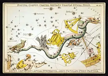Noctua (Latin: owl) was a constellation near the tail of Hydra in the southern celestial hemisphere, but is no longer recognized.[1] It was introduced by Alexander Jamieson in his 1822 work, A Celestial Atlas, and appeared in a derived collection of illustrated cards, Urania's Mirror.[2] Now designated Asterism a, the owl was composed of the stars 4 Librae and 54–57 Hydrae, which range from 4th to 6th magnitude.[3]