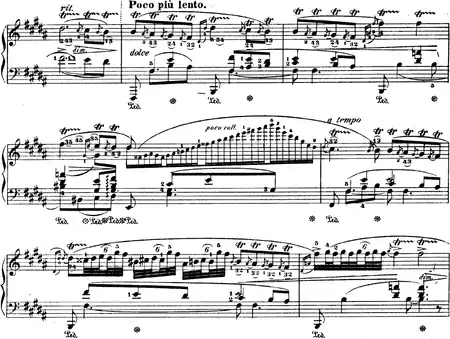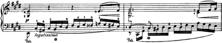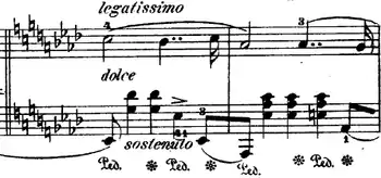 The middle section, in the distant key of A♭ major, is marked sostenuto and legatissimo. Though it begins softly, it can also be described as inhibited, showing unease, triggered by the play of syncopation of the left hand chords. Chopin ends this section with harmonic subtlety and delicacy.