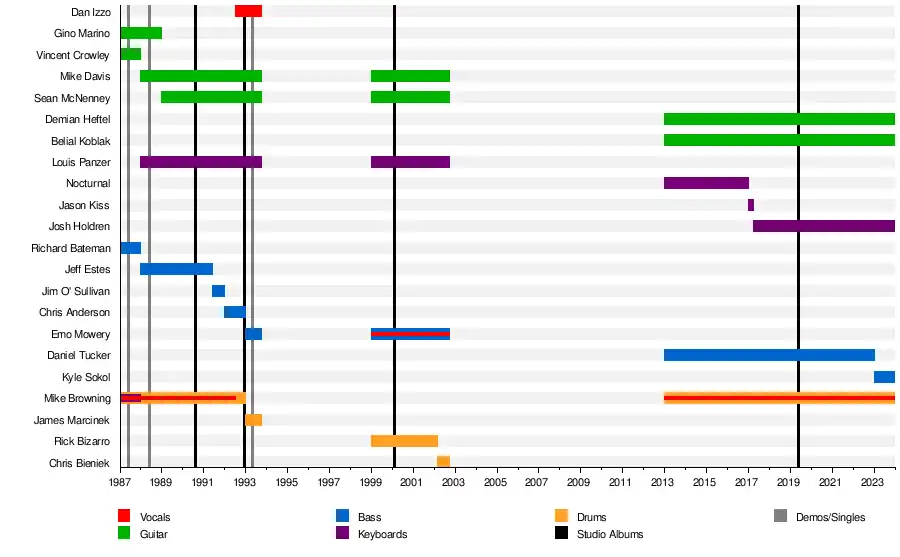 - Mike Browning - Drums, Lead Vocals (1987–1992, 2013–present)