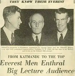 Noel Odell had a colourful career outside mountaineering as well, serving with the Royal Engineers in both World Wars, as a consultant in the petroleum and mining industries, and teaching geology at a number of universities around the world, including Harvard and Cambridge.[9] He was Professor of Geology at the University of Otago in New Zealand and Peshawar University in Pakistan.