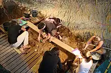 The presence of paleo-human remains in the cave was first suggested in 1898 by Armand Viré but only in 1985 it was visited again by caver E. Casteret who reported to the Regional Archaeology Service of the Midi-Pyrénées department. An initial survey operation was conducted in 1987 under the direction of Michel Allard in order to investigate the extent and impact of decades of illegal levies. Two field sessions in 1992 and 1993 were undertaken to assess the archaeological significance of the site and to determine appropriate protection measures. The subsequent excavation probe of a few square meters lead to the discovery of several cultural layers, relatively rich in Mousterian lithic vestiges and faunal remains and it was determined to permanently protect the site with a strong barred gate at the entrance.[5] This rescue campaigns's results remained mainly unpublished. In a few brief notes the site is usually presented as a temporary occupation site or hunting camp specialized on chamois (Rupicapra pyrenaica) and ibex (pyrenaica pyrenaica).[6] In 2004, another interdisciplinary research excavation was launched at the site, that lead to a number of new discoveries, in some cases results were contrary to earlier ones. The discovery of juvenile Neanderthal teeth, for example contradicts the hunting camp hypothesis of the site.