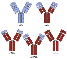 This naming scheme is used for both the World Health Organization's International Nonproprietary Names (INN)[6] and the United States Adopted Names (USAN)[7] for pharmaceuticals. In general, word stems are used to identify classes of drugs, in most cases placed word-finally. All monoclonal antibody names assigned until 2021 end with the stem -mab; newer names have different stems. Unlike most other pharmaceuticals, monoclonal antibody nomenclature uses different preceding word parts (morphemes) depending on structure and function. These are officially called substems and sometimes erroneously infixes, even by the USAN Council itself.[7]