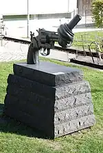 The oversized public version of the piece was planned for John Lennon’s memorial Strawberry Fields in Central Park.[5] This sculpture was made 1984,[6] but when the memorial was opened in 1985 Reuterswärd opted not to have it placed there, citing fears it would be stolen.[7] In 1988, the Luxembourg government bought and donated it to the United Nations. The sculpture was moved right outside of the headquarters of the UN.[8][9] Here it was interpreted not only a memorial for John Lennon, but as a symbol against violence and war anywhere in the world.