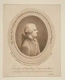 Colonel Norborne Berkeley, 4th Baron Botetourt (c. 1717 – 15 October 1770) was a British peer, Tory politician, military officer and colonial administrator who served as the governor of Virginia from 1768 to 1770, when he died in office.