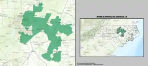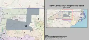 In 2022, the North Carolina Supreme Court rejected the redrawn districts, later approving a new map in which the 13th district included Johnston County and parts of Harnett, Wake, and Wayne Counties in the Raleigh area.[6]