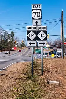 NC 114 was established between 1929 and 1930 by the North Carolina State Highway Commission.[2][3] It first appeared on official North Carolina state highway maps in 1930.[3] At the time of establishment, its southern terminus was located at an intersection with US 70 and NC 10 south of Drexel. It travelled north along its modern-day routing, ending at Oakland Avenue in Drexel. NC 114 was a hard surface paved road beginning at the time of establishment.[8] US 64 was extended east from Chattanooga, Tennessee along US 70 by 1933.[9][10][11] By 1935, NC 10 was truncated to NC 73 (modern day NC 16) in Newton, ending the concurrency with US 64 and US 70 and its connection with NC 114.[12][13] NC 114 was extended south along Drexel Road to its current southern terminus at I-40 in 1976.[14] In 1988, US 64 was re-routed between Morganton and Statesville to follow NC 18 and NC 90.[15] Since being extended south to I-40, the road's designation has not been changed.[5]