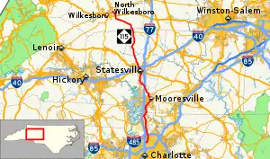 By 1933, NC 115 was extended north from the Iredell County-Wilkes County line to US 421 and NC 60 2 miles (3.2 km) east of Wilkesboro. The new section of NC 115 in Wilkes County was classified as a gravel, sand-clay, and topsoil roadway.[6] By 1940, NC 115 was completely paved between Statesville and Wilkesboro.[7][8] Within one year, the highway was extended north from its previous northern terminus to US 421 in North Wilkesboro. To accomplish this, NC 115 travelled along a brief concurrency with US 421 to the northwest. It then diverged from US 421 and travelled for approximately 1.4 miles (2.3 km) to NC 18 and NC 268. At the intersection, NC 115 turned southwest to run concurrently with the highways. Within North Wilkesboro, NC 115 used B Street and D Street as split streets between US 421 and Sixth Street. Sixth Street provided the connection for NC 115 between the two split streets. [9][10] By 1959, NC 115 was extended south to US 21 near Charlotte. The highway ran concurrently with US 21 for 13 miles (21 km) between Statesville and Shepards. the highway then travelled along its own routing through Mooresville, Davidson, and Huntersville. It ran in concurrency with US 21 or closely paralleled US 21 between its new southern terminus and Statesville.[11] On March 1, 1975, NC 115 was removed from its concurrency with NC 18 and NC 268 in North Wilkesboro and was truncated to its current northern terminus.[12] On August 26, 2003, northbound NC 115 was removed from Main Street between McClelland Street and Iredell Avenue, and Iredell Avenue between Main Street and Broad Street in Mooresville. The highway was rerouted to briefly follow McClelland Street between Main Street and Broad Street and then follow Broad Street to Iredell Avenue.[13]
